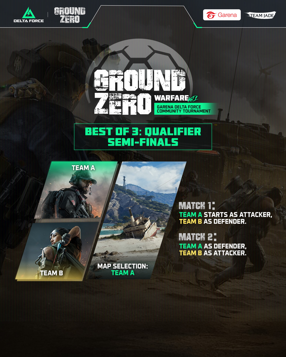 - Match 1: Team A plays as Attacker, Team B as Defender.