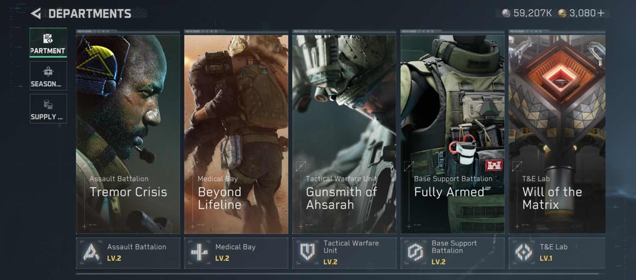 This section contains your Departments. They contain missions that you can complete to get rewards and level up your Departments.