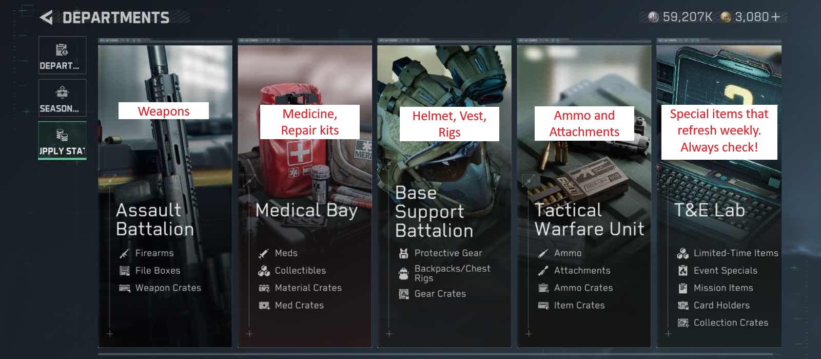 Almost all the items that you need in battle are available here, but you can unlock other special items by leveling up your Departments.
