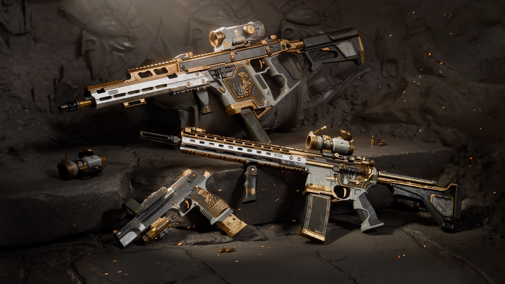 Descripción general del paquete: Aspectos de arma de la serie Ira de Ares (Vector, M4A1, Desert Eagle), Amuleto de la serie Ira de Ares, Tarjeta de identificación, Avatar y Aerosol.