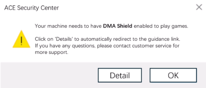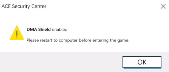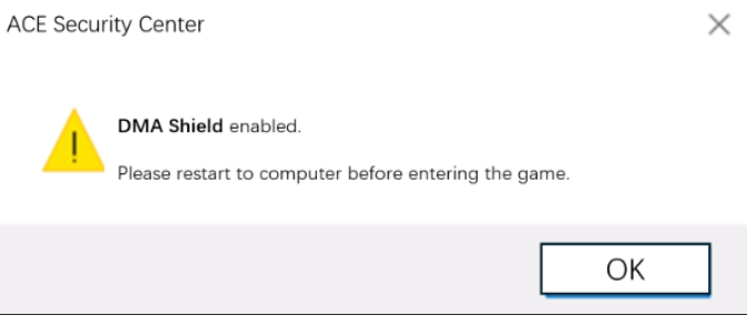Ini adalah fitur perlindungan hardware DMA yang telah ditingkatkan dan diluncurkan oleh A.C.E. Berbasis pada fitur keamanan Windows yang sudah ada, ‘Kernel DMA Protection’, fitur ini meningkatkan perlindungan terhadap hardware eksternal yang tidak normal, mencegah akses tidak sah ke memori oleh hardware eksternal, dan menghindari serangan DMA; sehingga melindungi akun Anda dari eksploitasi jahat.