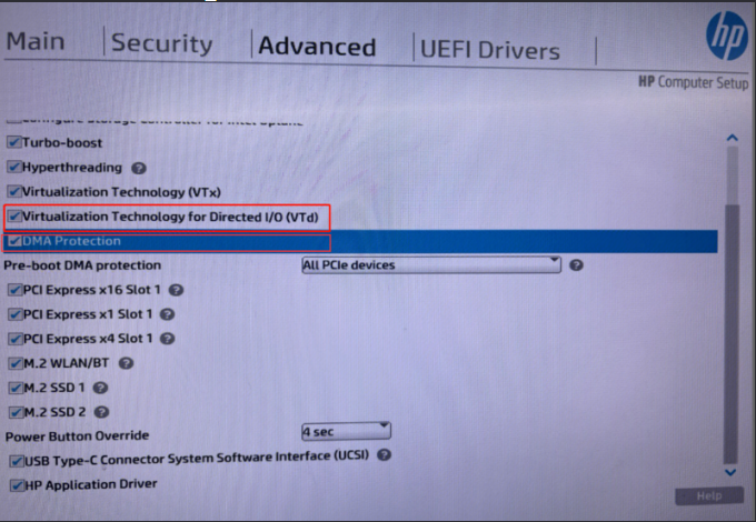 2. Masuk ke Pengaturan Lanjutan, cari opsi VTd dan DMA Protection Options