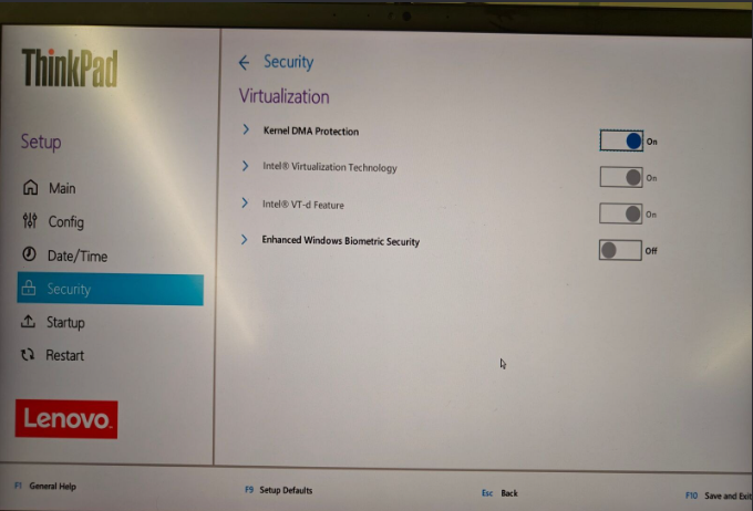 2. Masuk ke Security->Virtualization, temukan fitur Intel VT-d dan opsi DMA Protection Option