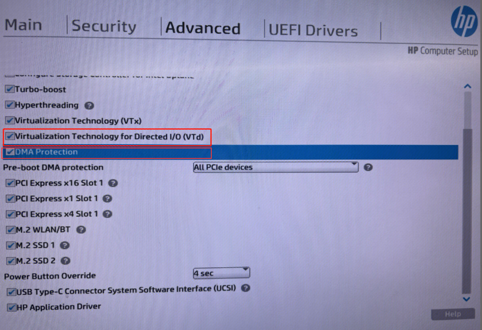 2. Entre em Advanced,encontre as opções de proteção VTd e DMA