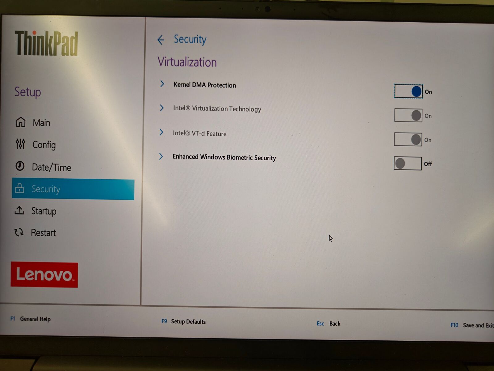 2. Entre em Security->Virtualization,Encontre a opção de proteção DMA de Kernel e o Recurso Intel VT-d
