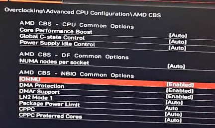 2. Entre em Advanced-> AMD_CBS,encontre IOMMU,e altere “Disabled/Auto” para “Enabled”