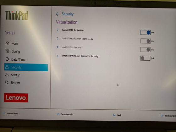 2. ไปที่เมนู Security → Virtualization จากนั้นค้นหาตัวเลือก Intel VT-d Feature และ Kernel DMA Protection