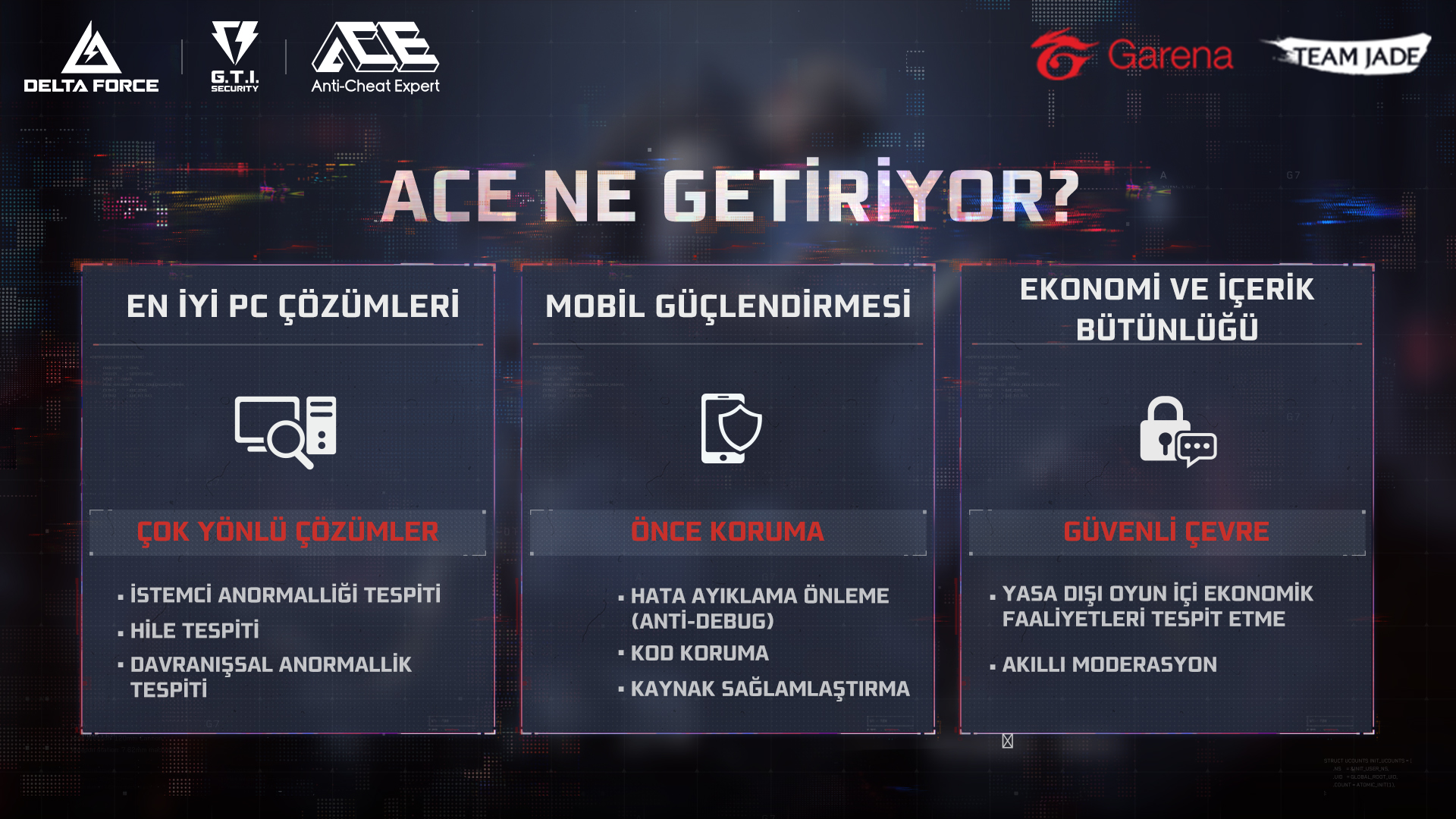 ACE’i seçkin bir gözetleme birimi gibi düşünebilirsiniz. Sadece tek bir tehdit türüne bakmaz; oyun ortamını en temelden korumak için tasarlanmış kapsamlı ve “tek noktadan” bir güvenlik matrisi sunar. ACE ile iş birliği yaparak, tek bir amaca adanmış 20 yıllık veri ve özel teknolojiden yararlanıyoruz: Adil bir oyun alanını korumak.