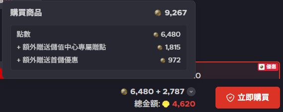 活動期間首次儲值 NT$ 3,300 元面額,總計可獲得 9,267 三角幣 (6,480 + 1,815 + 972),其中 972 三角幣為 該面額首儲 15% 回饋。