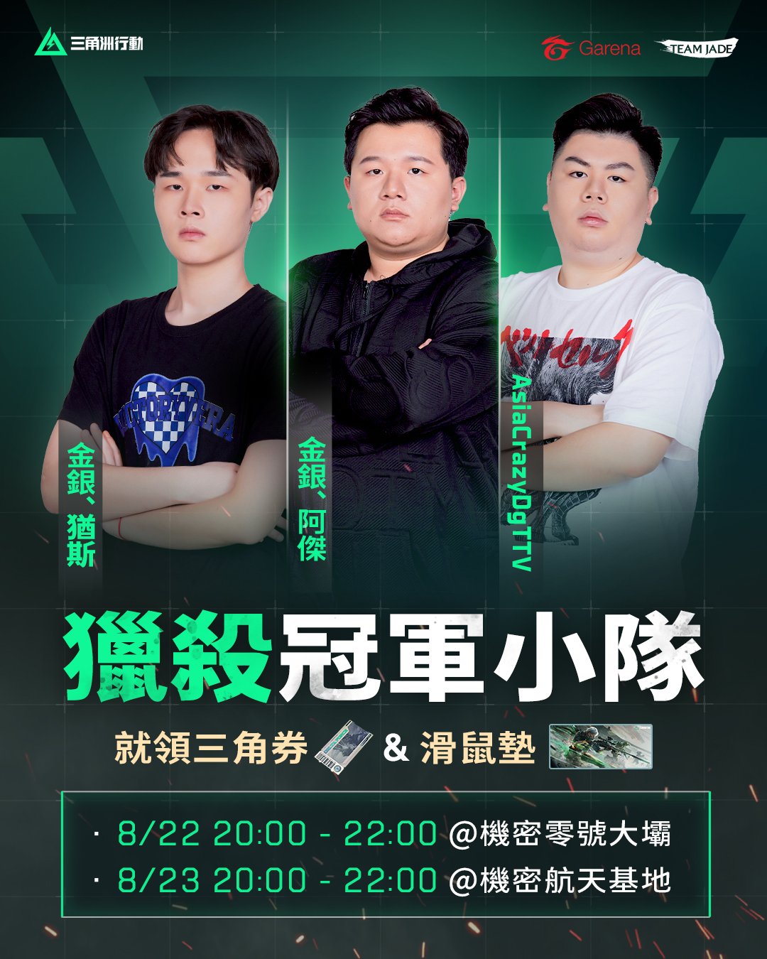 滅隊冠軍隊 (該局小隊成員的擊殺列表上需有全部以下三個名字): 金銀、阿傑 金銀、猶斯 AsiaCrazyDgTTV |